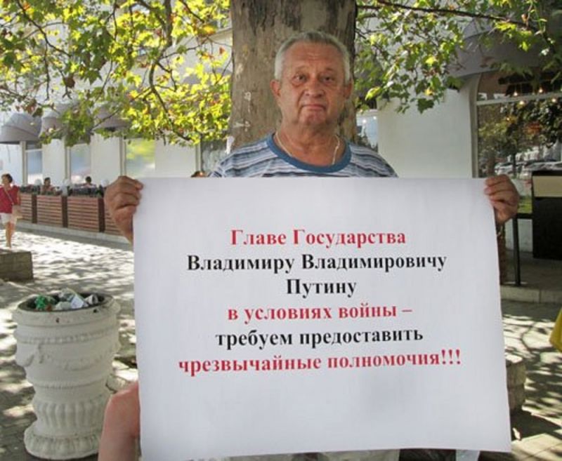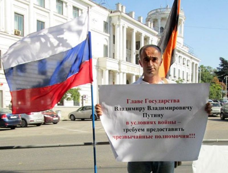 Из-за этого визита на севастопольских улицах уже активизировались члены НОД и "Казачья Черноморская Сотня". Они требуют предоставить Путину особые полномочия в связи с военным конфликтом (как будто у него их не хватает). Судя по фото, скоро это может стать действительностью, ведь "народ требует".